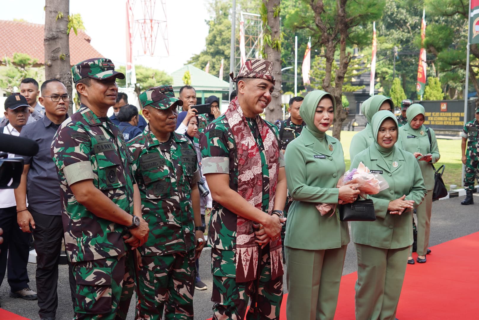 Komandan Korem 084/Bhaskara Jaya, Brigjen TNI Danny Alkdrie, mendampingi Panglima Kodam V/Brawijaya, Mayjen TNI Rudy Saladin, M.A., beserta Ketua Persit Kartika Chandra Kirana Daerah V/Brawijaya, Ny. Vira Rudy Saladin, dalam kunjungan kerja ke Markas Komando Distrik Militer (Kodim) 0829/Bangkalan, Selasa (3/6/2025).