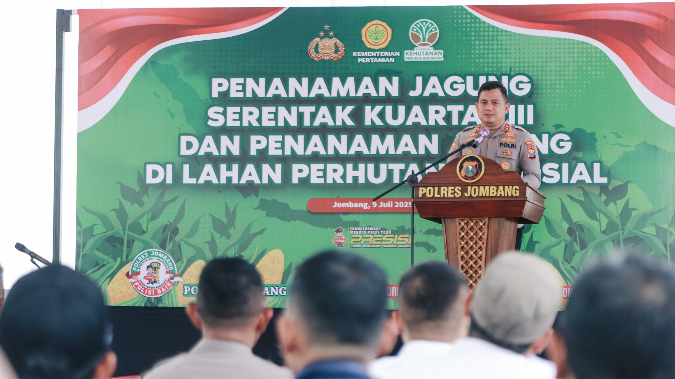 Jombang,bangjo.co.id Dalam rangka mendukung swasembada pangan tahun 2025, Polres Jombang melakukan penanaman jagung serentak 1 Juta Hektar di lahan seluas 10.000 meter persegi (1 Ha) yang terletak di lahan Perhutanan sosial petak 1D Perhutani Desa Japanan Kec. Mojowarno Kab. Jombang. (Rabu (9/7/2025).
