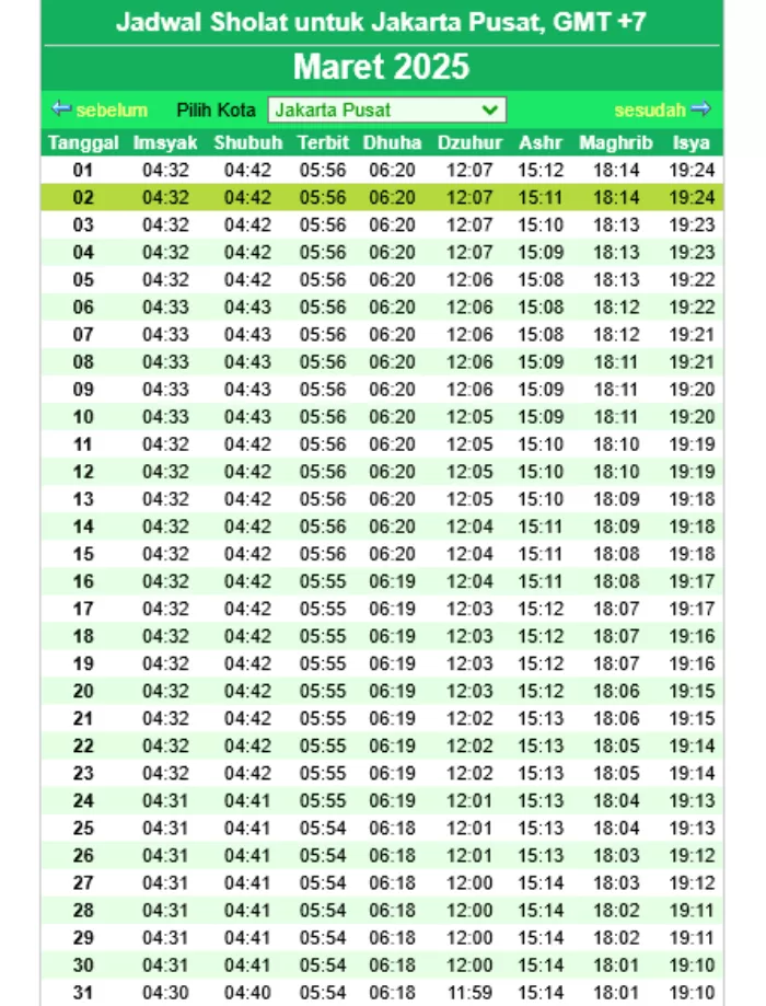 Berikut adalah daftar lengkap waktu sholat untuk setiap hari di bulan September 2025 di Jakarta. Informasi ini mencakup lima waktu sholat utama, yaitu Subuh, Dzuhur, Ashar, Maghrib, dan Isya’.