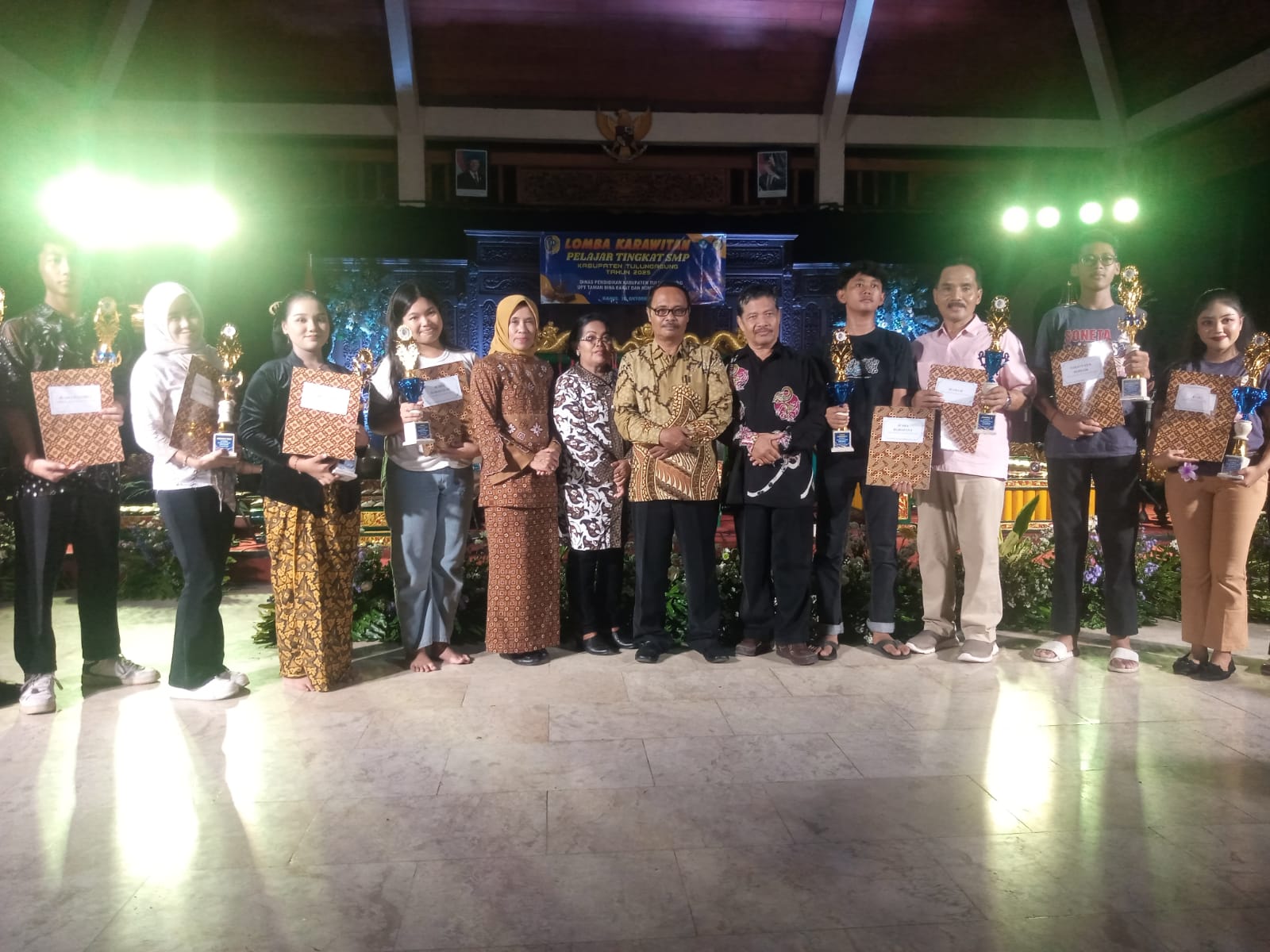 Pemenang lomba karawitan pelajar tingkat SMP Kabupaten Tulungagung tahun 2025, pengendang terbaik diraih peserta nomor 10 dari SMP Negeri 1 Ngantru, dilanjutkan wiro suoro terbaik diraih peserta nomor 30 dari SMP Negeri 1 Tulungagung, selanjutnya sinden terbaik diraih peserta nomor 31 dari SMP Negeri 1 Ngunut, dilanjutkan dengan juara vavorid diraih peserta nomor 18 dari SMP Negeri 3 Tulungagung, dilanjutkan dengan juara harapan tiga diraih peserta nomor 20 dari SMP Negeri 2 Tulungagung, juara harapan dua diraih peserta nomor 28 dari SMP Negeri 1 Sumbergempol, juara harapan satu diraih peserta nomor 15 dari SMP Negeri 1 Boyolangu, dan dilanjutkan juara tiga diraih peserta nomor 34 dari SMP Negeri 2 Campurdarat, juara dua diraih peserta nomor 13 dari SMP Negeri 1 Campurdarat dan juara satu diraih peserta nomor 30 dari SMP Negeri 1 Tulungagung.