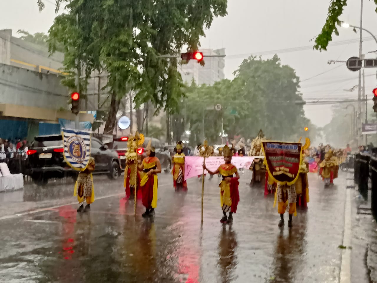 Secara spontan, para pejabat turun dari panggung kehormatan dan berdiri di tepi jalan, memberikan tepuk tangan dan semangat langsung kepada para siswa tanpa mengenakan jas hujan. Momen ini menjadi simbol dukungan nyata Pemerintah Kabupaten Jombang terhadap semangat generasi muda.