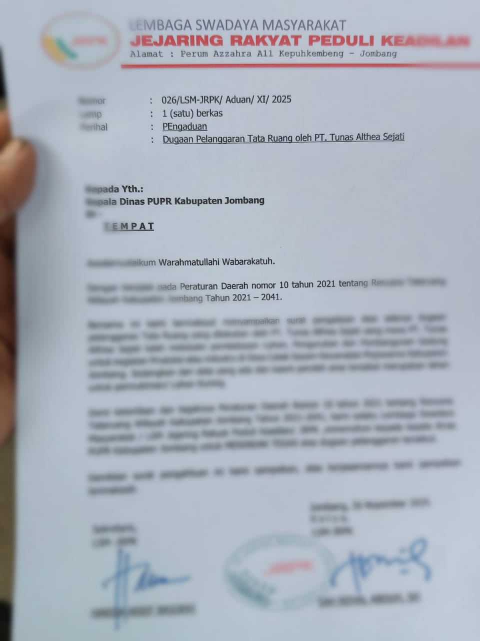 JOMBANG ,Bangjo.co.id— LSM Jejaring Rakyat Peduli Keadilan (JRPK) mengungkap dugaan pelanggaran tata ruang yang dilakukan PT Tunas Althea Sejati di Desa Catak Gayam, Kecamatan Mojowarno. Aktivitas pembangunan gedung dan pengurukan lahan yang mengarah pada kegiatan industri disebut bertentangan dengan peta zonasi resmi Kabupaten Jombang.